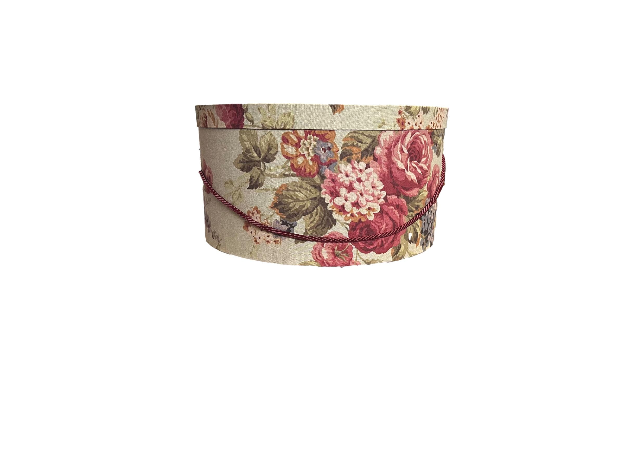 Extra Large Hat Box in Red, Purple on Tan Floral Fabric