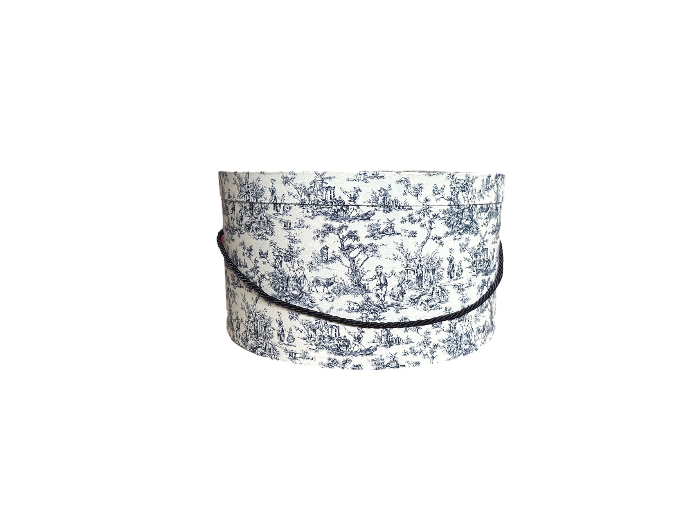 Beautiful Large Hat Box in Navy Blue and Cream Toile Fabric