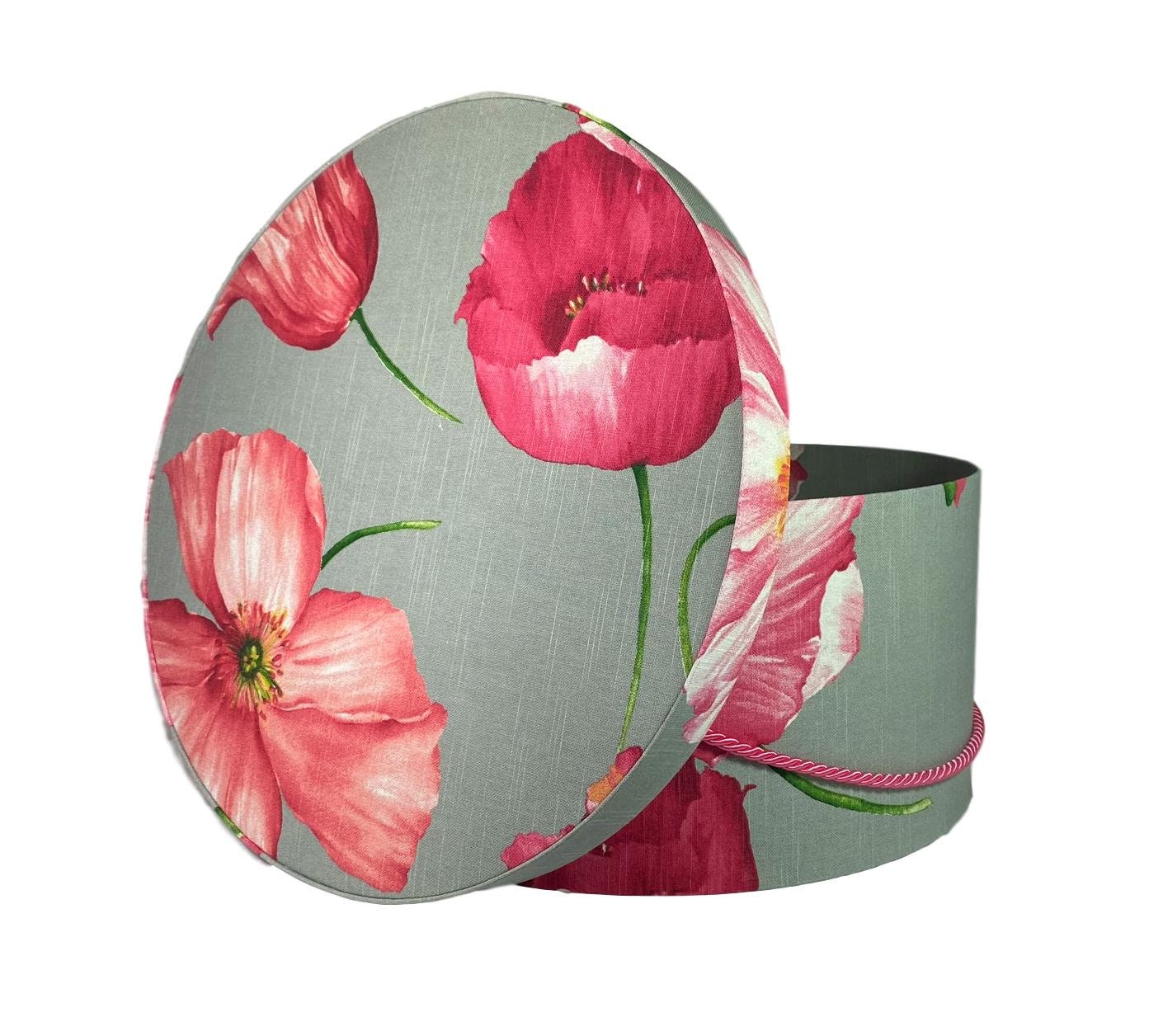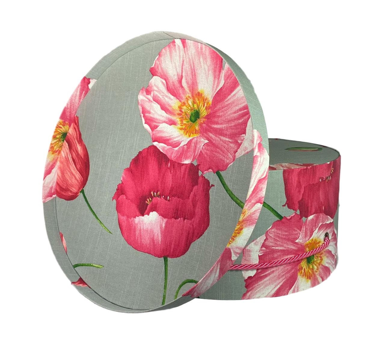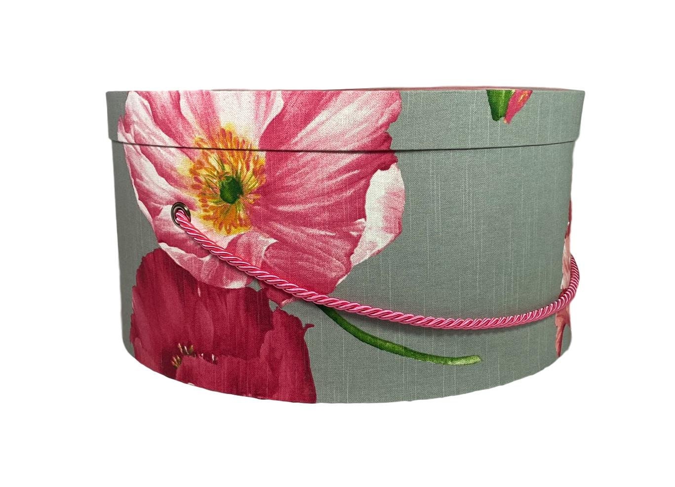 Beautiful Large Hat Box in Large Pink Flowers on Grey Fabric
